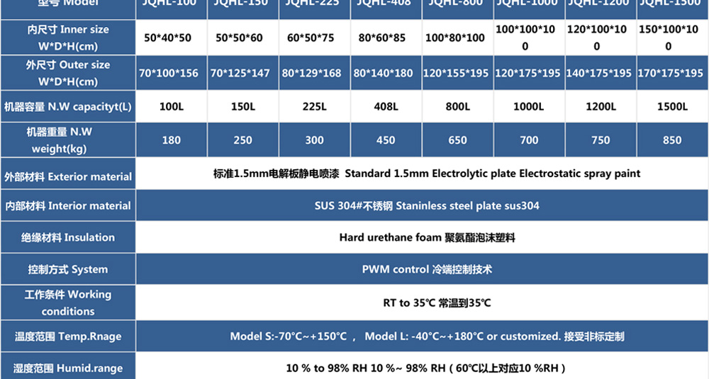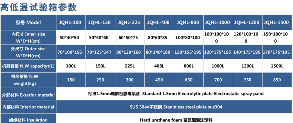 用途:高低溫試驗(yàn)箱 JQHL-100L-1000L為電子、電工、儀表、零部件、材料等試驗(yàn)樣品進(jìn)行高溫、低溫、或者恒定試驗(yàn)的溫度環(huán)境變化后的參數(shù)及性能測(cè)試。適用于汽車、航空、高校,專業(yè)實(shí)驗(yàn)室研究開發(fā)