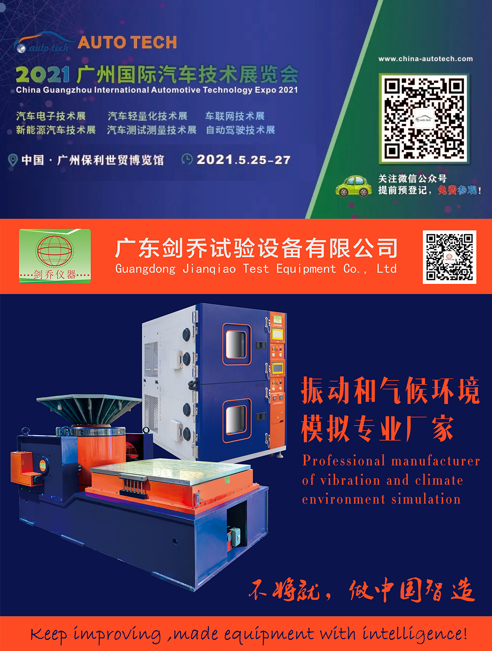 2021年5月25-27日,廣東劍喬試驗(yàn)設(shè)備有限公司【劍喬儀器】將攜旗下最新試驗(yàn)設(shè)備亮相AUTO TECH 2021 中國(guó)·廣州第八屆國(guó)際汽車技術(shù)展覽會(huì),現(xiàn)場(chǎng)展示:振動(dòng)試驗(yàn)系統(tǒng)、溫濕度振動(dòng)三綜合箱、高低溫防爆試驗(yàn)箱、高加速?zèng)_擊試驗(yàn)臺(tái)、電池?zé)釣E用試驗(yàn)機(jī)、電池短路試驗(yàn)箱、等試驗(yàn)設(shè)備及動(dòng)力電池相關(guān)試驗(yàn)解決方案。