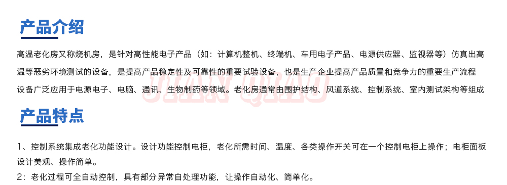 產(chǎn)品型號:JQHTA-12(非標定制) 品牌:劍 喬 用途:高溫老化房又稱燒機房,是針對高性能電子產(chǎn)品(如:計算機整機、終端機、車用電子產(chǎn)品、電源供應器、監(jiān)視器等)仿真出高溫等惡劣環(huán)境測試的設備,是提高產(chǎn)品穩(wěn)定性及可靠性的咨詢熱線:13829135130