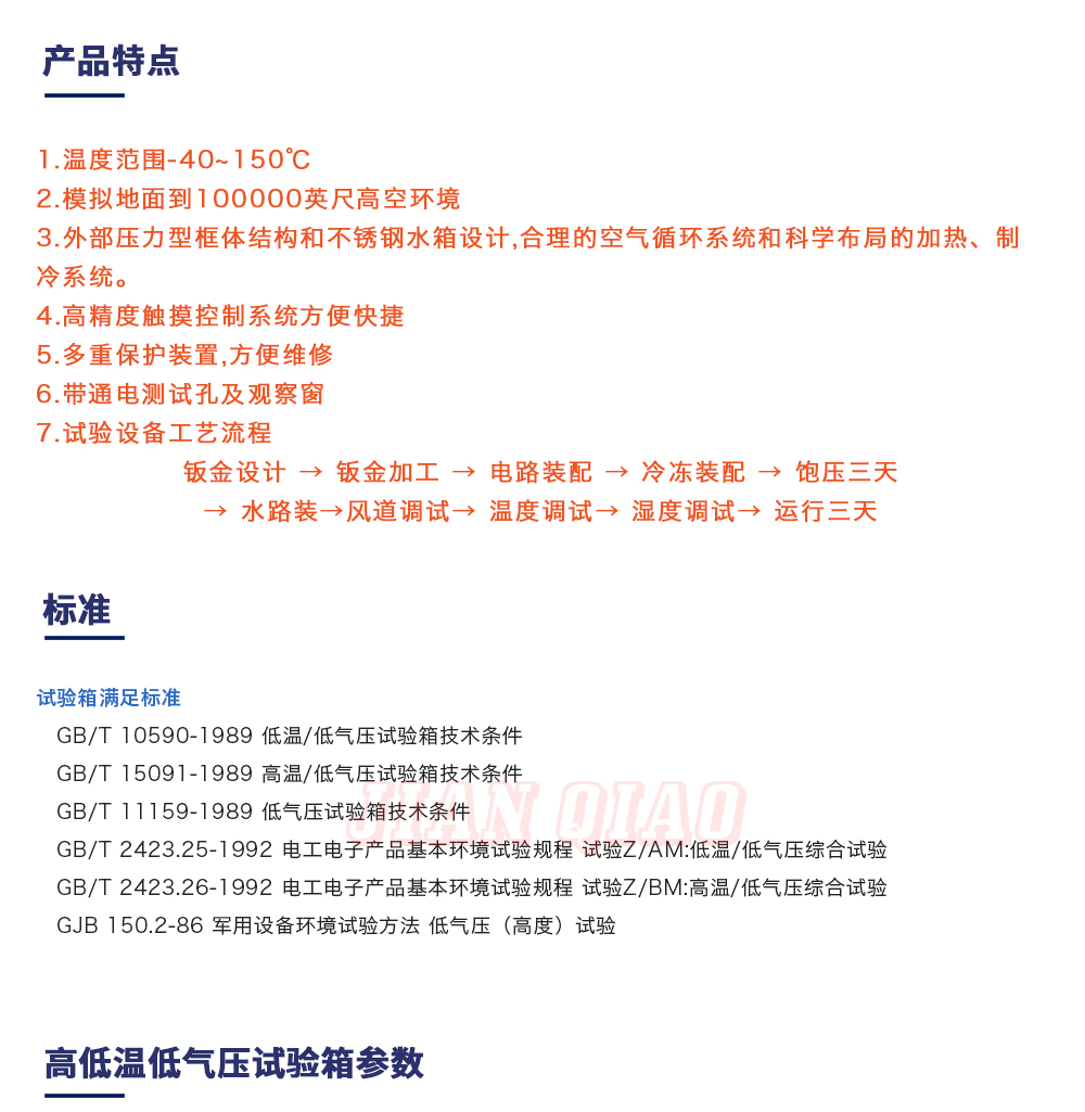 產品型號:JQTA-225 品牌:劍 喬 用途:高低溫低氣壓試驗箱:主要用于試驗工件在低氣壓、高溫低溫、凝露、結霜單項或同時作用下的環(huán)境適應性與可靠性試驗,并或同時對試件通電進行電氣性能參數(shù)的測量。咨詢熱線:13829135130