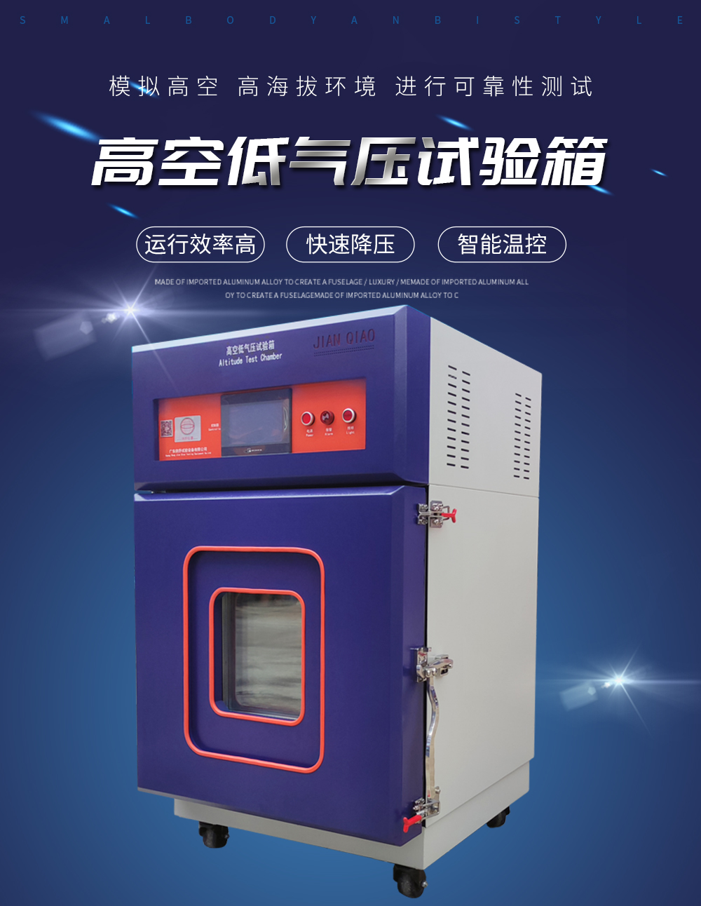 產(chǎn)品型號:JQTA-225 品牌:劍 喬 用途:高空低氣壓試驗箱可以模擬高海拔、高空、(高原地區(qū))氣候進行貯存運用、運輸可靠性試驗,并可同時對試件通電進行電氣性能參數(shù)的測試設(shè)備。適用于國防工業(yè),航天工業(yè)自動化零組件,汽車咨詢熱線:13829135130
