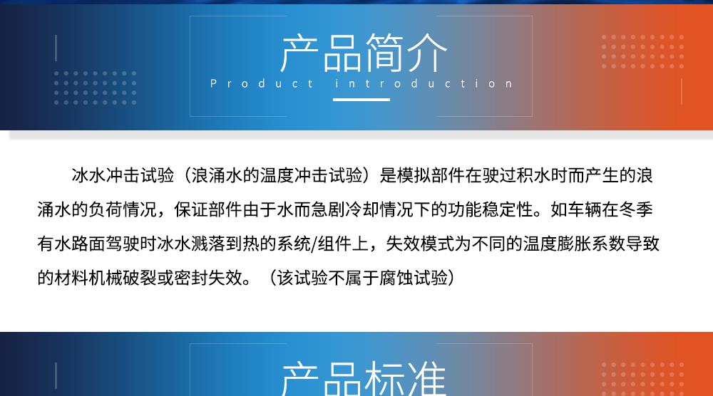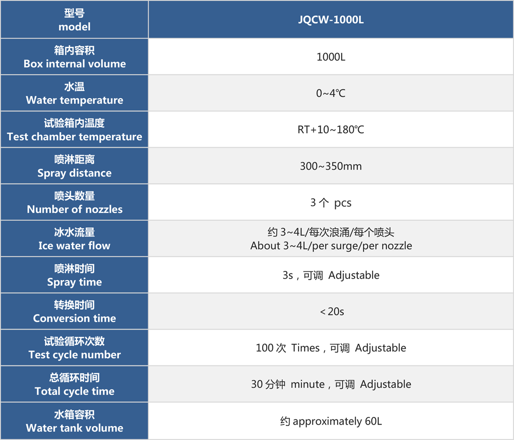 產(chǎn)品型號:JQCW-1000L 品牌:劍 喬 用途:冰水沖擊試驗(浪涌水的溫度沖擊試驗)是模擬部件在駛過積水時而產(chǎn)生的浪涌水的負荷情況,保證部件由于水而急劇冷卻情況下的功能穩(wěn)定性。如車輛在冬季有水路面駕駛時冰水濺落到熱的系統(tǒng)/組件上,失效模式為不同的溫度膨脹系數(shù)導(dǎo)致的材料機械破裂或密封失效咨詢熱線:13829135130
