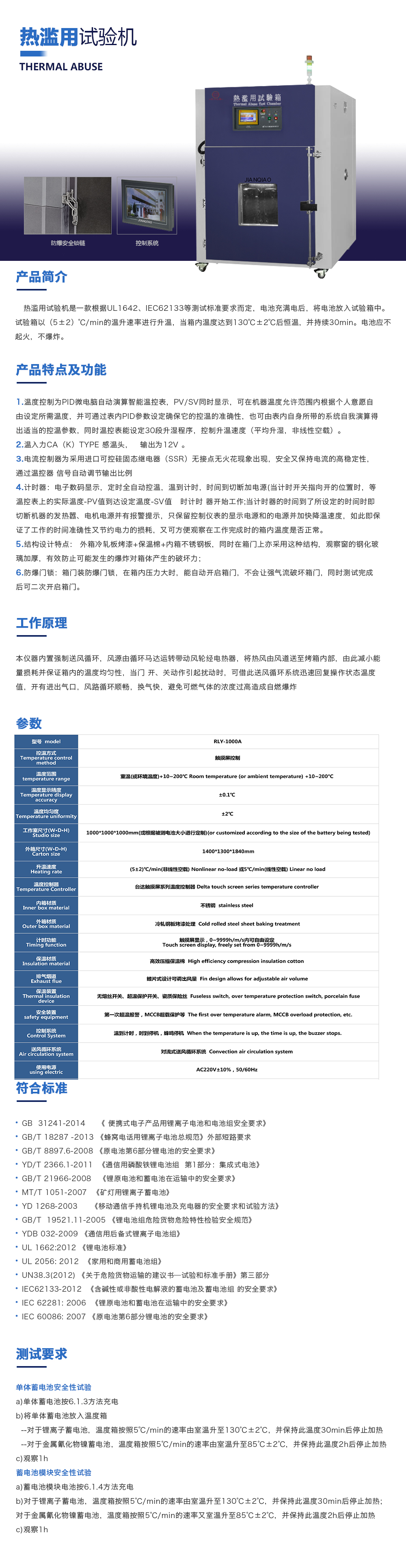 產(chǎn)品型號:JQ-8103 品牌:劍 喬 用途:熱濫用試驗箱是一款根據(jù)UL1642、IEC62133等測試標準要求而定,電池充滿電后,將電池放入試驗箱中。試驗箱以(5±2)℃/min的溫升速率進行升溫,當箱內(nèi)溫度達到130℃±2℃后恒溫,并持續(xù)咨詢熱線:13829135130