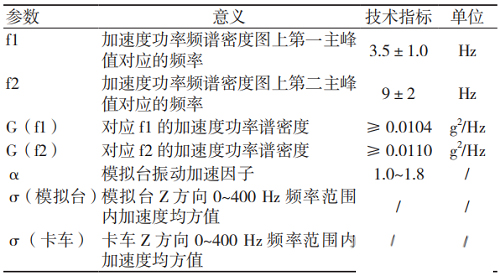 模擬運(yùn)輸臺(tái)的設(shè)計(jì)參數(shù)主要依據(jù)《QJ/T 815.2-94產(chǎn)品公路運(yùn)輸加速模擬試驗(yàn)方法》[3]設(shè)定。該標(biāo)準(zhǔn)中規(guī)定了模擬運(yùn)輸臺(tái)的關(guān)鍵技術(shù)指標(biāo),見(jiàn)表1。