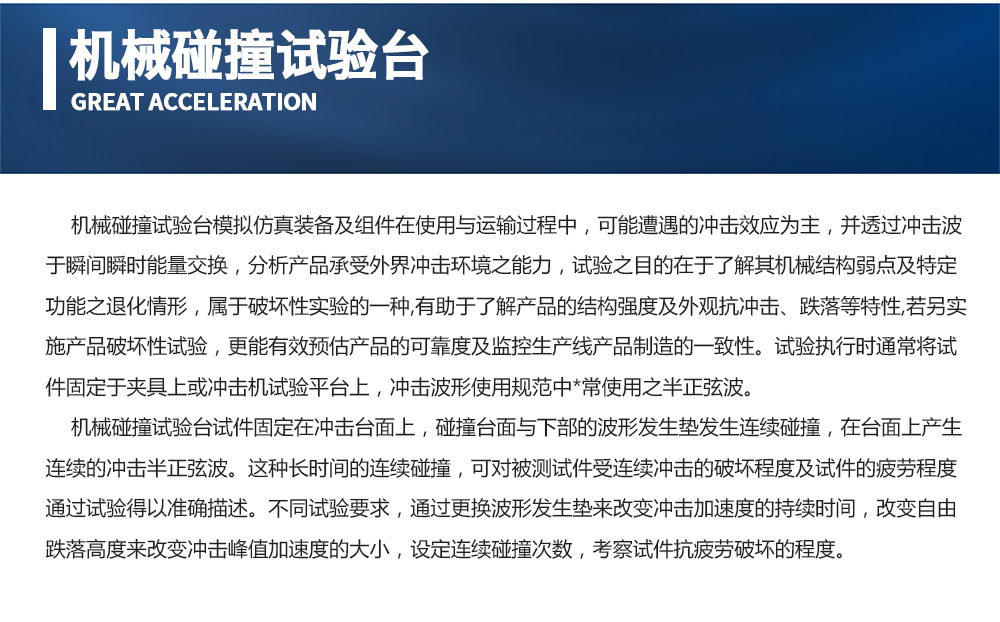 產品型號:JQJ-100 品牌:劍 喬 用途:機械碰撞試驗臺模擬仿真裝備及組件在使用與運輸過程中,可能遭遇的沖擊效應為主,并透過沖擊波于瞬間瞬時能量交換,分析產品承受外界沖擊環(huán)境之能力,試驗之目的在于了解其機咨詢熱線:13829135130